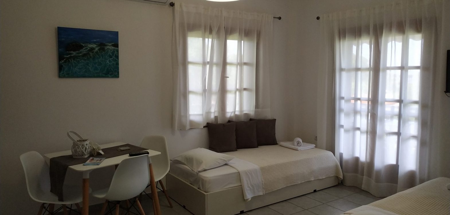 Το Blue Appartment αποτελείται από ξεχωριστή κρεβατοκάμαρα με διπλό κρεβάτι, 2 μονά κρεβάτια, εξοπλισμένη κουζίνα, πλήρως ανακαινισμένο μπάνιο και μεγάλο μπαλκόνι.